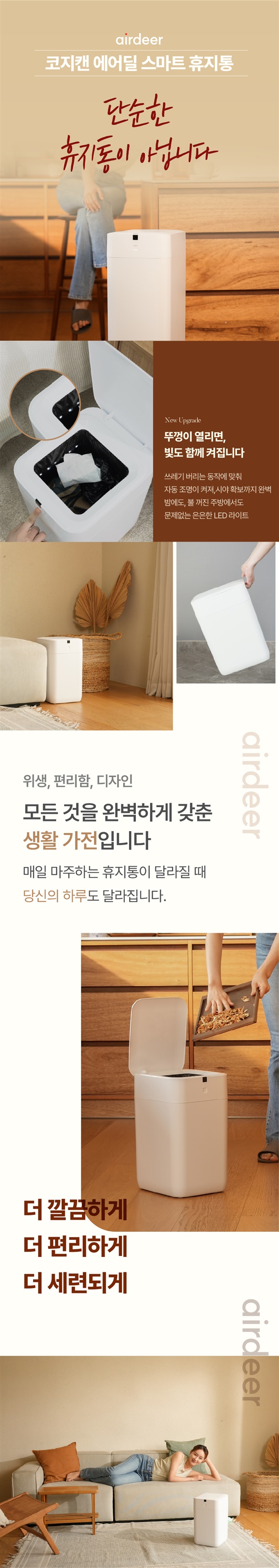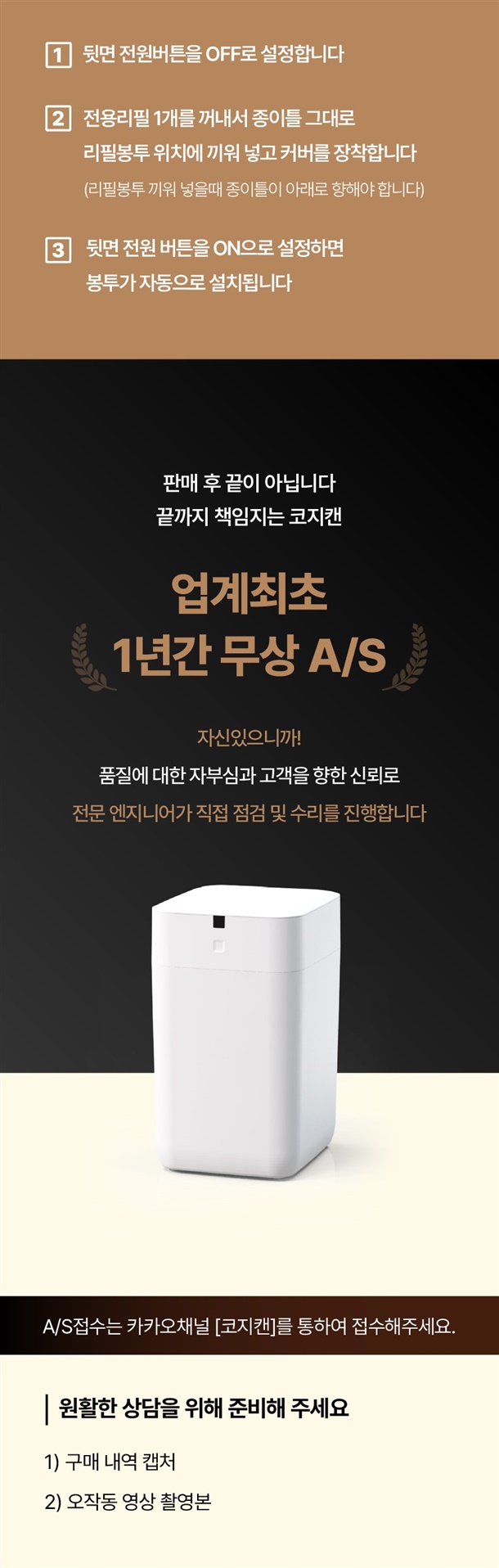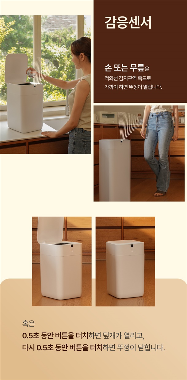 사용전 코지캔스마트휴지통의 센서위치를 확인해주세요. 센서 감응 범위는 검정 네모 앞이 아니고 윗부분입니다. 센서감응 범위를 인체공학적 디자인으로 허리를 굽히지 않고 편한 자세로 휴지통을 사용 할수 있습니다.(제품 상세페이지에서 센서 감응 범위를 참고해주세요)